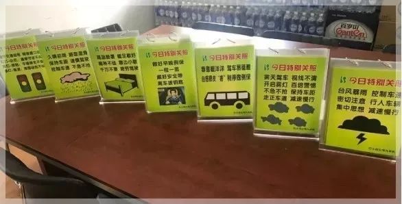 巴士四公司所有线路调度室里,都摆放了醒目的“今日特别关照”黄色铭牌,根据不同气候及道路情况,提供相应的安全提示,提醒当班驾驶员提高警惕,在特殊天气谨慎驾驶。公司还派出多名管理人员,到易积水路段监测,一旦发现积水深度大于车型安全涉水深度时,严禁车辆驶入。