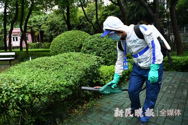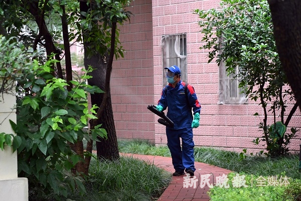 图说:工作人员正在对小区的排水设施进行针对性的灭虫药物播撒 新民晚报记者徐程 摄(下同)