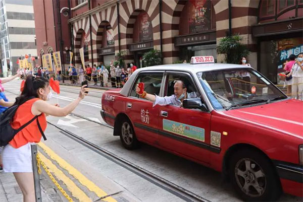 图说:7月1日上午,香港出租车司机看见手拿五星红旗的市民,拍照留念