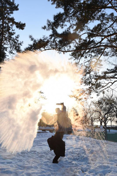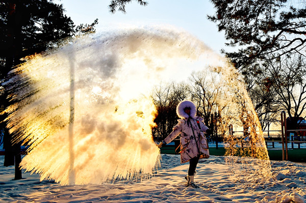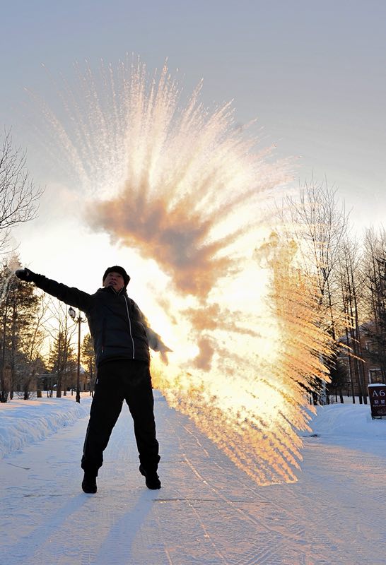 岁末年初,在冰城哈尔滨,一种超级玩法爆棚,在朋友圈小伙伴之间广泛传播。这一甩一跳,在太阳的映趁下,奇幻出现了,高扬并甩动手臂洒出的水,在户外低温下瞬间成冰,在玩耍者周围形成冰的弧线,美丽且刺激,小伙伴们给这项游戏起了个名字:泼水成冰。