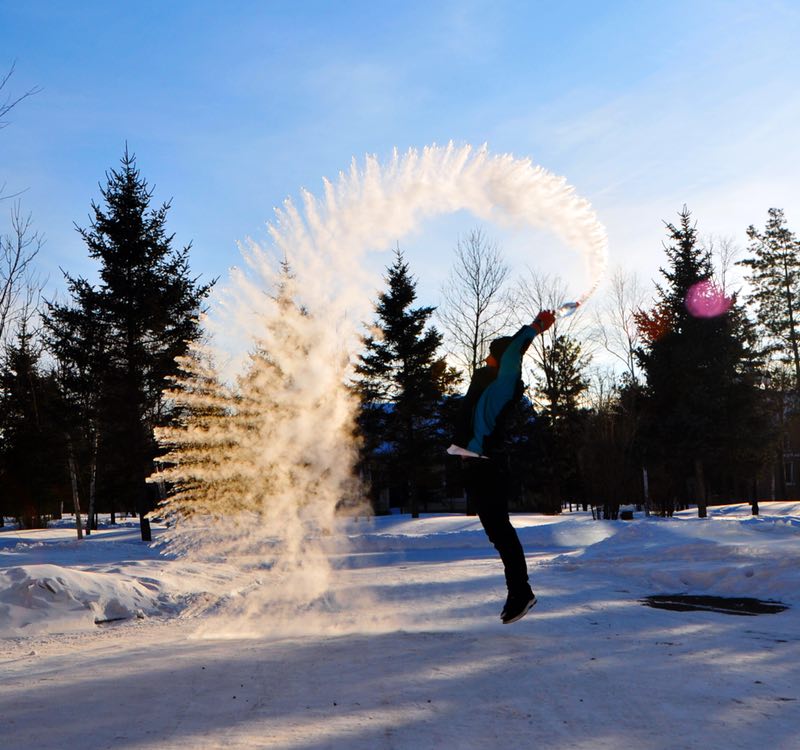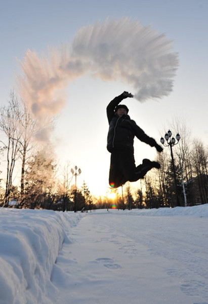 玩法:将热水灌入金属保温杯或塑料瓶 (一定不能用玻璃瓶) ,单手握住将其沿地平线向上方划动180度,也可以跳起完成。这时泼洒出去的热水遇强冷气流瞬间凝固成冰,并伴有气浪产生,形成“冰淞”。掉落的水滴在衣服上变成冰珠,就像威士忌加冰块一样噼啪作响。如果由摄影师扑捉到这转瞬即逝的美,就更加开心啦。