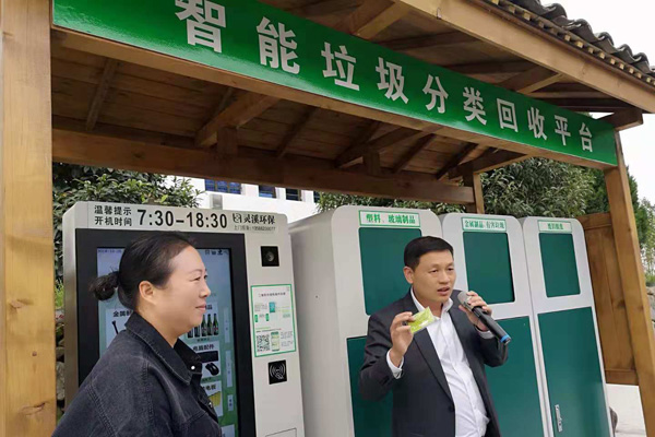 图说:陈小静(左)和镇领导在介绍源头村的垃圾分类回收经验