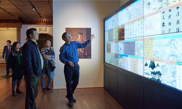 比如,在董其昌展里,你会看到几块触摸大屏。你可以点击放大书画作品,许多隔着玻璃、光线暗弱的情况下原作上看不真切的笔墨,如今历历可数,清晰可辨;你可以点一点,就看到董其昌的“朋友圈”是怎么回事……这是信息中心的探索。