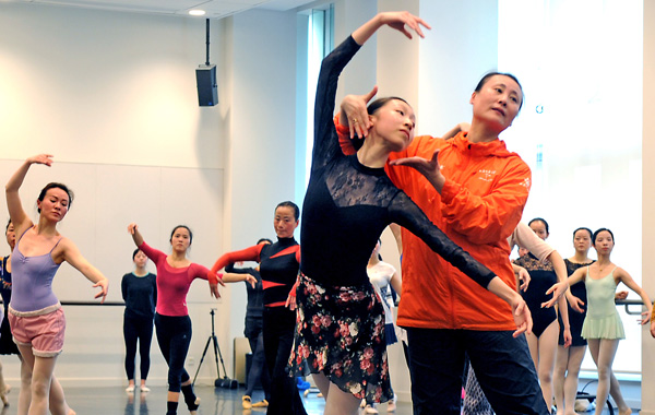 辛丽丽为学员纠正芭蕾形体姿势(摄于2017年)