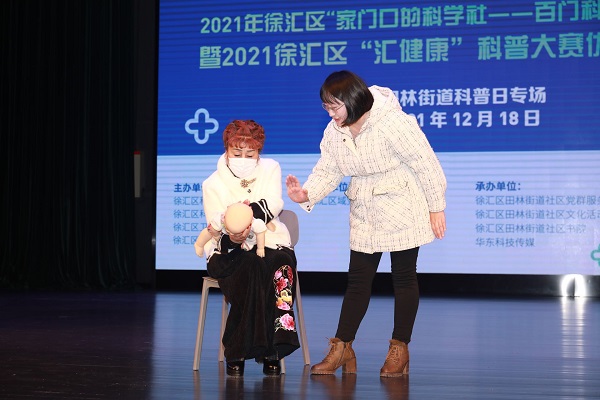 家里有小宝宝,万一碰到孩子胡乱吞咽,发生异物卡喉的情况,该怎么办?和普通讲座不同,复旦大学附属眼耳鼻喉科医院耳鼻喉科护士曹文竹把婴儿模型带到了现场,生动演绎在婴儿不小心异物卡喉时,应该怎么急救。看着简单的操作,实践起来却不容易,曹文竹现场邀请了一位家里有小宝宝的居民上台,进行了实训模拟演练,手把手的教授让居民们看得仔细,学得明白,练得顺手。