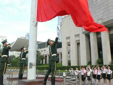 凌晨五点半,孩子们早早来到了人民广场,等待升旗仪式。和学校升旗仪式不同的是,人民广场的升旗仪式没有音乐伴奏,但国旗班武警战士们仍然迈着整齐的步伐,庄严地护卫着五星红旗进场,为孩子们演示着平时只有在电视里才看得到的护旗、展旗动作。