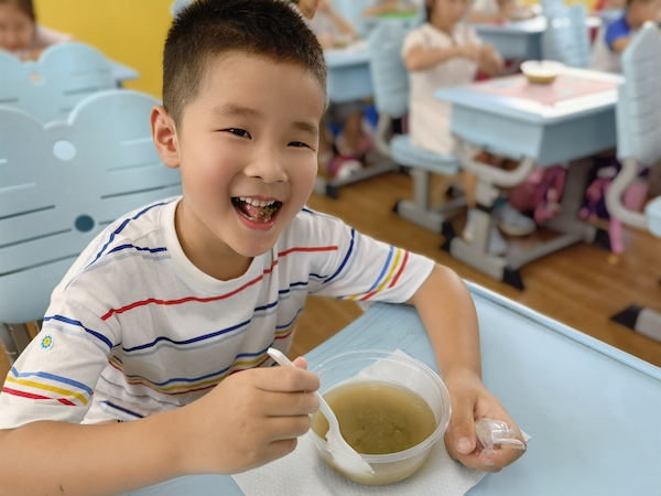 图说:体测完毕,老师们给学生送上一碗甜甜的绿豆汤,孩子们笑容灿烂