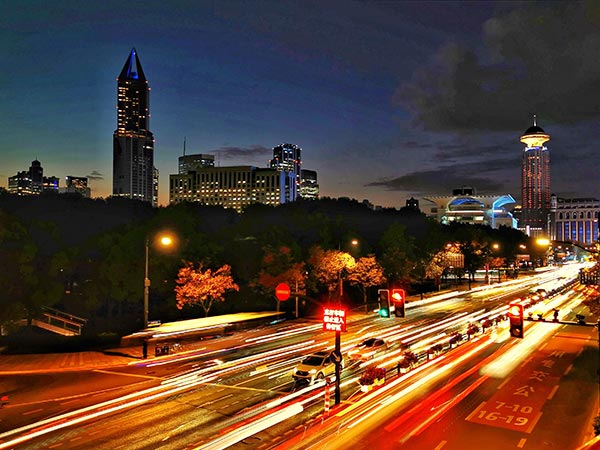 再如车水马龙的操作(图4:车流),建议选天色将暗未暗的傍晚,这时为最佳拍摄时间,道路上的车辆已开启夜间行驶灯,暗蓝色天空则可勾勒建筑物轮廓。拍摄可选人行天桥、高楼窗户或街边较安全的位置进行,既能拍到五光十色车流轨迹,也能拍出周围壮观的环境,以丰富画面元素,按快门方式与上述几个相同。(谢震霖)