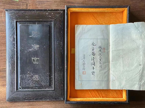“钱瘦铁和他的朋友圈展”在上海中国画院展出时,有朋友发现在《钱瘦铁篆刻毛主席诗词十首》的原打印谱旁,有个老红木盒,盒盖上刻“持衡室”三字,便问我有什么出处吗?“持衡室”是书法篆刻家陆康先生的斋名。原来,陆先生在得知我家已经没有完整的钱瘦铁刻毛主席诗词印谱后,就把他当年问学于我爷爷钱瘦铁时亲手打的,已经陪伴了他一甲子的印谱,无偿地赠予了我。因为这本印谱是他的珍爱之物,他特别寻了这个老红木盒,并刻上斋名用以珍藏之。