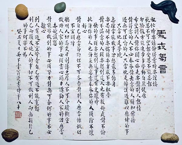 不久前,我收到了他自费为祖父印制的《陆澹安楷书字义入门》,设计精美,装帧考究。陆先生巧心设计,不惜工本,不作销售,只为和大家分享,特别用来送家有小孩的朋友们,以获书法入门之窍槛。以前,曾听陆先生讲过多次,他小的时候,爷爷澹安公是如何用手书的正楷方块字卡片教他和家里的小朋友们习字的往事。正是这些工整而精巧的唐楷卡片,让他从小萌生了对书法的兴趣,也以此打下了坚实的楷书基础。书中,他还为每个字都标注了篆字写法以及《说文解字》里的注释。陆先生对其祖父吉光片羽极其珍爱,并乐于把让他受益终身的陆家家训无私地与大家分享。书中所附赠的家训原件是陆澹安老先生在80岁时手写的,内容包括:匆忙时要镇静,得意时要谨慎;施恩不可望报,受恩不能忘报;要忍耐不要懦弱,要勇敢不要粗鲁……这些人生的经验实在宝贵,值得大家学习并传家。