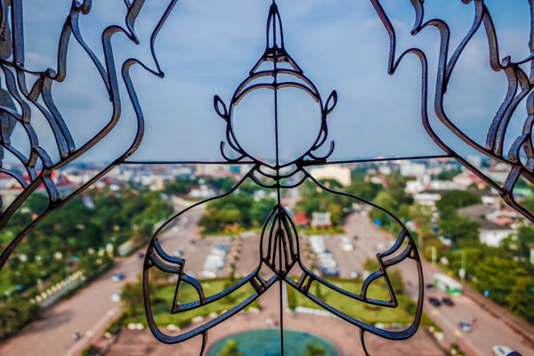 走到凯旋门里,我抬头看了顶上的檐壁装饰,精美的佛教雕刻展示了老挝传统艺术的精华。拾级而上,几个楼面是小商品市场,琳琅满目。登上楼顶放眼万象的市容,澜沧大道如同一条“垂直的跑道”。旅友则把澜沧大道笑称为东方的“香榭丽舍大道”。