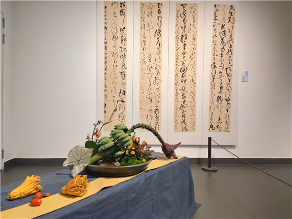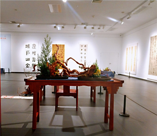 此次牵手的花道专家禾莯女士是禾泰文化的负责人,她告诉新民晚报记者,此次布置是考虑了美学空间在环境布局之上与人的精神对话和情思的融通,烘托出安宁、幽静的气氛,利用有限的展厅,来表现出文人与世无争、精神超脱的生活状态。展厅入口放置了行书和草书,那么配上盘根植物,让人联想到中国汉字的象形起源是来自水陆草木。“中国古典插花和书法都起源于人民的日常生活,后期都发展成为一种造型艺术,并且都蕴含深刻的美学原理,它们讲究技法的表现和空间结构,在艺术创作上,也同样注重意境的表达和创造。插花和书法两者在运用上存在诸多相通之处。”