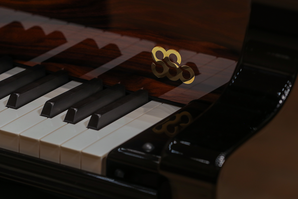 钢琴主体由珍贵的桑托斯红木制成,顶盖一侧是典雅内敛的黑色乌金桑托斯红木,近看时黑色木纹清晰可见。背面一侧则另有乾坤,以上交140“音乐点亮城市”的主视觉为设计灵感,桑托斯红木原有的深褐色木材呈现出光线照射时的渐变效果,从顶盖中心宝石般的深褐逐步过渡到周边的寂静黑色,重现了舞台上聚光灯下的高光时刻,寓意140年前上交诞生的那一刻。
