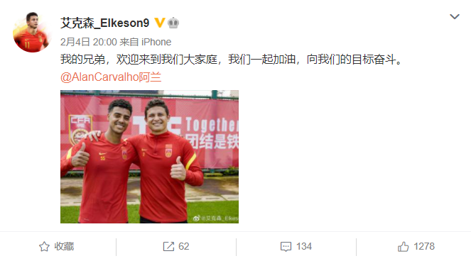 速度奇快、突破能力出众的阿兰,无疑能给国足的锋线提供更大的帮助。他的巴西同胞艾克森也特意在个人微博上晒出两人的合影,并写道:“我的兄弟,欢迎加入我们的大家庭,我们一起加油,向我们的目标奋斗。”