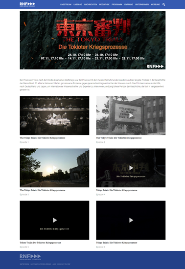 《东京审判》的德语译制版,于2020年10月24日,在德国最⼤的区域电视台——莱茵内卡电视台的晚间黄金时段开播,平台还在官⽅⽹站开设了专题页面,同步直播并长时间保留影⽚,在社交媒体上也展开了联动宣传。不少德国观众表示:“珍贵的史料和镜头,让人们了解到这段历史,看到了中国对历史的客观再现和尊重,这是对世界和平的呼唤。”