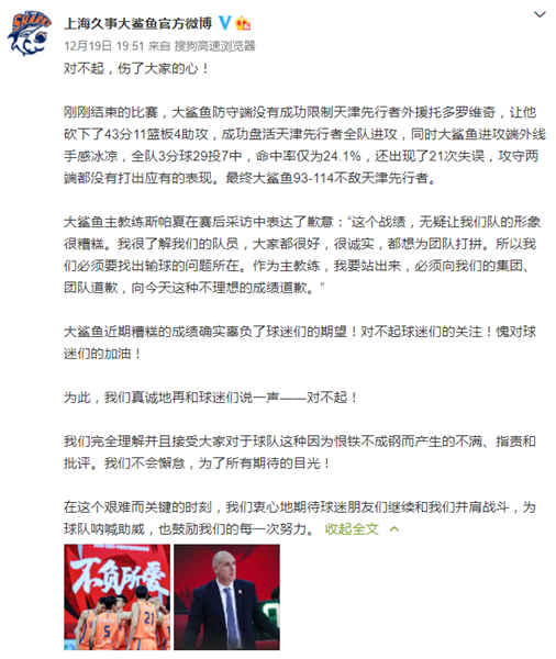 “对不起,伤了大家的心!”“大鲨鱼近期糟糕的成绩,确实辜负了球迷们的期望!对不起球迷们的关注!愧对球迷们的加油!”