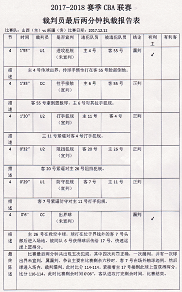 时间回到2017-2018赛季,山西队主场对新疆队的比赛最后时刻出现争议,CBA第一次将裁判报告公诸于众。从那以后,如果比赛最后2分钟分差在5分或5分以下,CBA都会出台一份裁判报告,向外界公布比赛关键时刻的裁判判罚准确性。