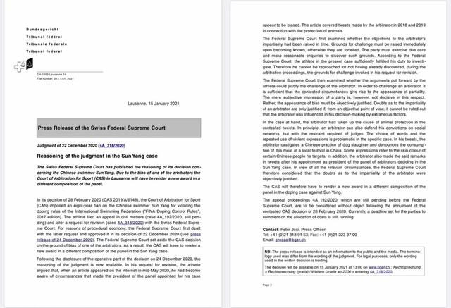 瑞士联邦最高法院(以下简称瑞士高院)昨天发布关于支持中国游泳运动员孙杨诉请、案件重新审理的详细裁决书,具体解释了于2020年12月24日发布的新闻公报,表示孙杨举证有效,时任仲裁小组主席的弗拉蒂尼存在偏见。
