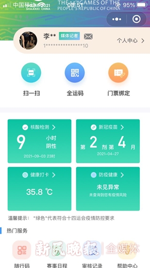 “您好,请出示陕西‘全运通’小程序上的健康码,并配合测温安检后进入。”在媒体村安检通道处,每位入村人员都要按照指定通道间隔1米排队,有序查验证件、亮码测温,经过安检后才能进入全运村。入村当天,记者就按照要求进行了一次核酸检测,而根据规定,这样的检测每隔48小时就要进行一次。每次到了提前开赛的花游、射击、蹦床等比赛场馆,记者们都要进行验证、测温等,此外还需要和现场观众保持距离,避免接触。哪怕每次都是大巴车来回接送,不会与外人接触,但记者们每次回到媒体村,均需重新进行安检,并且要验证核酸有效期——有记者就因为回村时核酸已经超过48小时,而不得不临时接受核酸检测,几个小时后等核酸结果出来才可以进村。